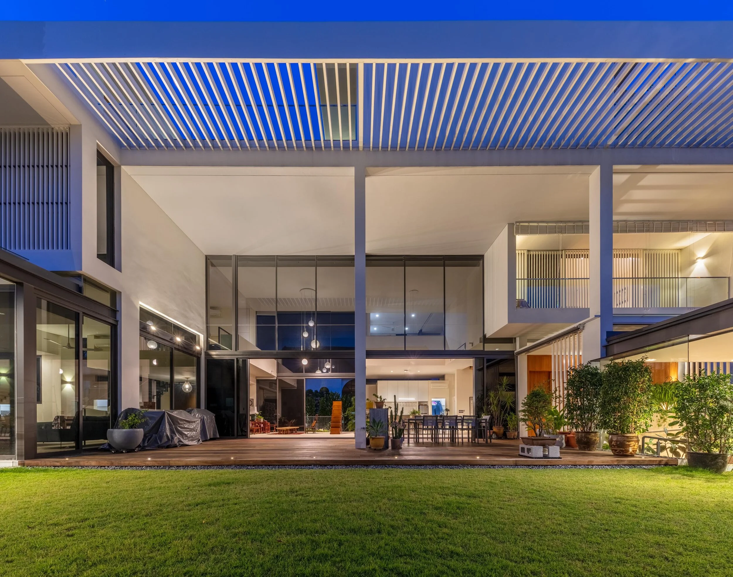The front and the back facades of the main 1st storey living spaces have been opened up to the maximum, using transparent roller shutters that disappear into the ceiling and allow the prevailing winds to flow through the house. Surrounding this main living area are two external gardens at the front and back of the house. The front garden is a quaint chill-out area that was planted on top of the car porch roof below, which creates a sensuous green backdrop to the living room. The rear of the house is designed as a small swimming pool directly off the dining area that is nestled in front of a textural boundary wall embedded with plants and ventilation blocks. These three main garden and courtyard spaces of the home allow the occupants to feel the movement of the natural light across the house throughout the day while shading them from it harsh impact. Several levels of tiered opens spaces can be seen while looking above the central courtyard, each planted with trees and creeping plants that bring the eye up and diagonally through the house and enhance the long views through the various spaces and greenery to the blue skies beyond.